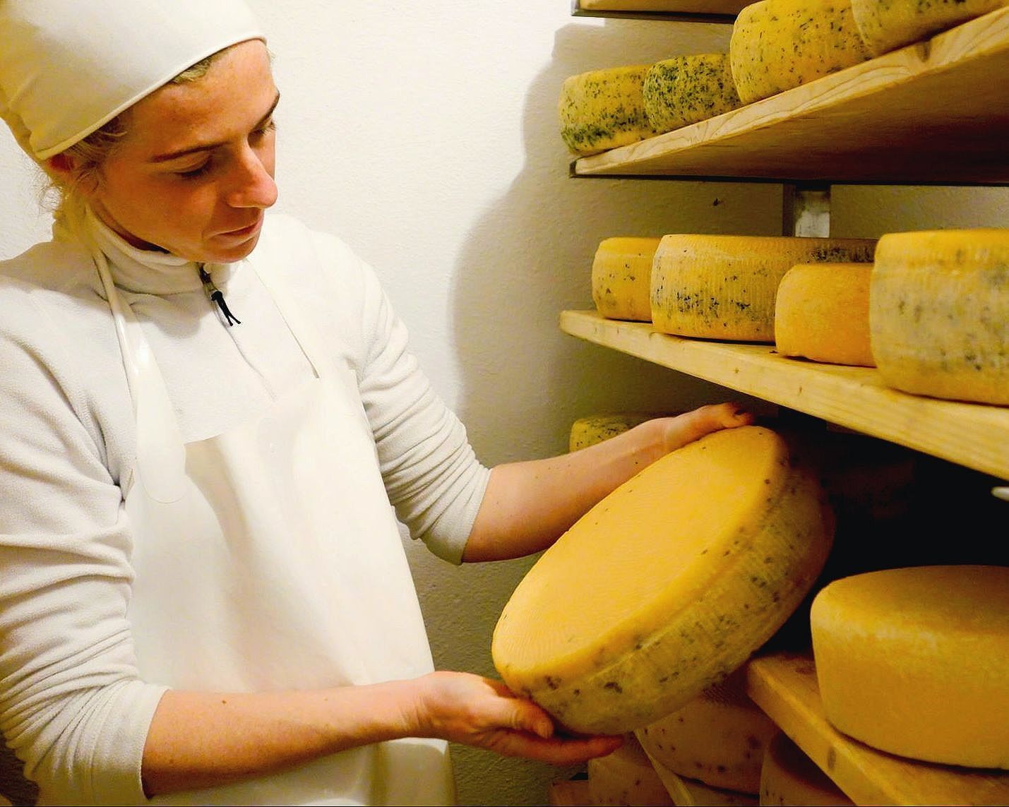 Faszinierend, was man aus Milch und Bakterienkulturen machen kann. Käse herzustellen ist vielfältig, abwechslungsreich, erfordert Genauigkeit und Hingabe, macht viel Arbeit, die mich jedoch am Ende des Tages zufriedenstellt. Dieser Beruf ist für mich sinnstiftend. Ich darf die Kuhmilch meines elterlichen Hofes veredeln. Zusätzlich ziehe ich mir meine eigene kleine Ziegenherde heran. Das freche, kluge und humorvolle Wesen dieser Tiere hat es mir angetan. Sie machen mir Freude. Aus Ihrer besonders fein beschaffenen Milch lässt sich milder Ziegenfrischkäse und die etwas kräftigeren Schnittkäsesorten herstellen. Wir vollenden unsere Produkte mit frischen Kräutern der Saison, die wir entweder von der ebenfalls im Ort ansässigen